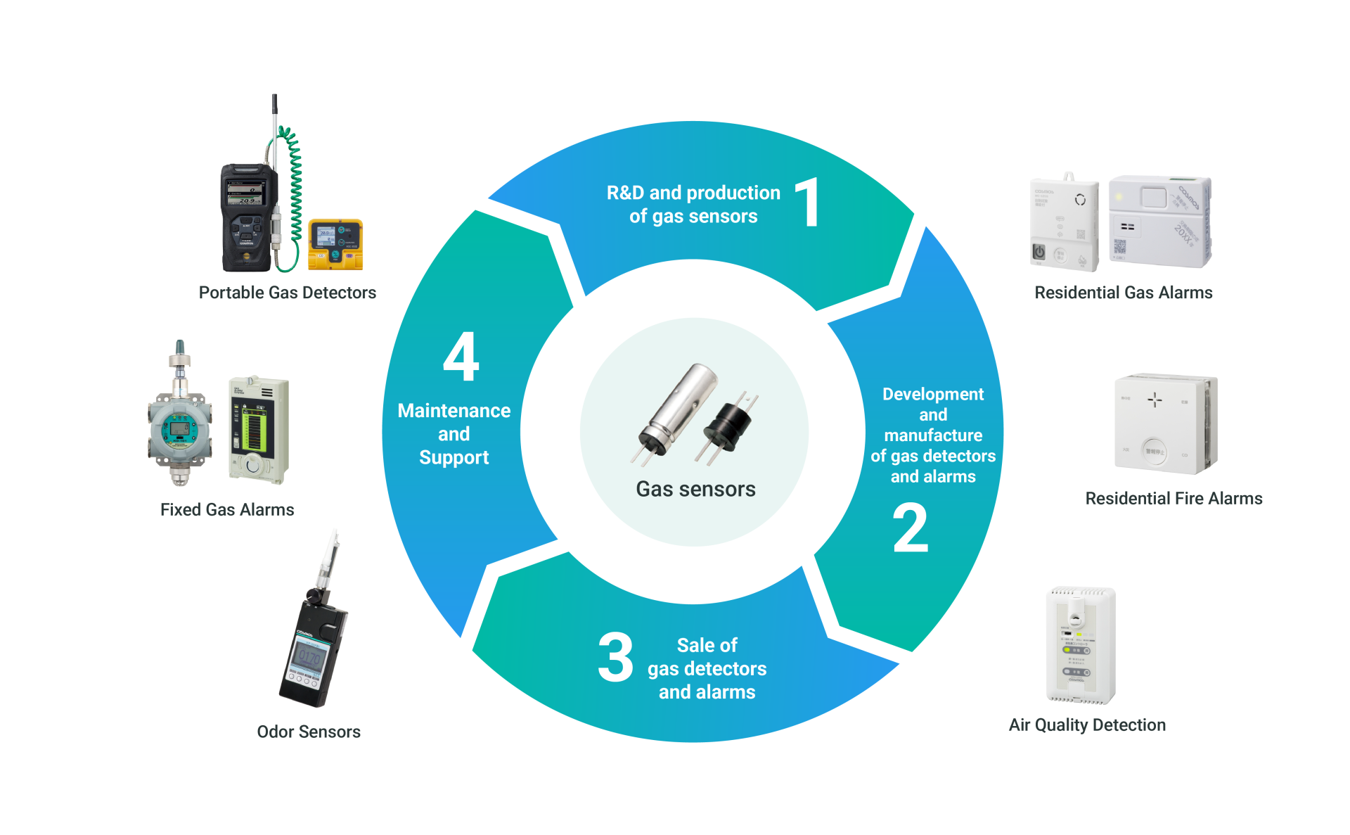 เครื่องตรวจจับแก๊สแบบติดตั้ง และระบบเตือนภัยในโรงงานอุตสาหกรรม รวมถึงเซ็นเซอร์ตรวจจับกลิ่นและผลิตภัณฑ์อื่น ๆ